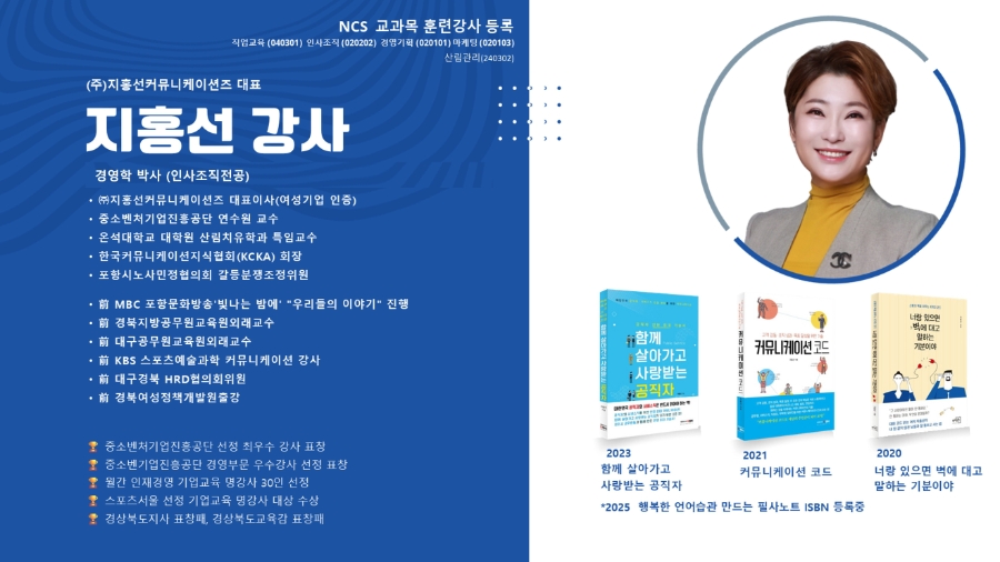 ㈜지홍선커뮤니케이션즈 대표이자 NCS 교과목 훈련강사로, 인사조직·경영기획·마케팅·직업교육 분야에서 공공기관, 기업, 교육기관을 아우르는 실무 중심의 교육을 진행하고 있습니다.