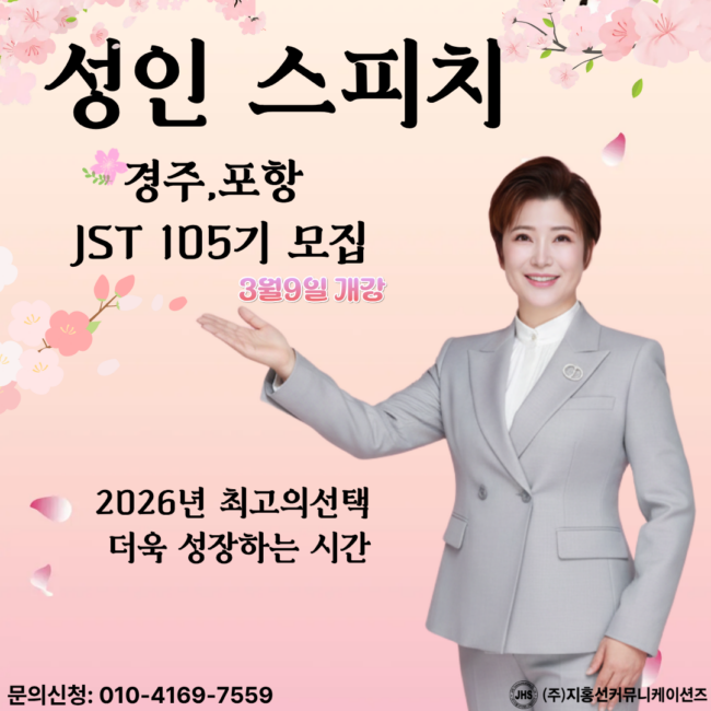 📌 모집 개요 과정명: JST 스피치 정규과정 (105기) 개강일: 2026년 3월 09일 (월) 대상: 성인 / 직장인 / 강사 / 커뮤니케이션 역량을 키우고 싶은 누구나 장소: 경상북도 포항시 남구 대이로 9번길 5, 2층 (주)지홍선커뮤니케이션즈 포항 본원 문의 및 신청: 054-282-4206 💬 105기 Special Program 매주 월요일이 기다려지는 마법 같은 수업! – 8주 커리큘럼 1주차|리더십…
