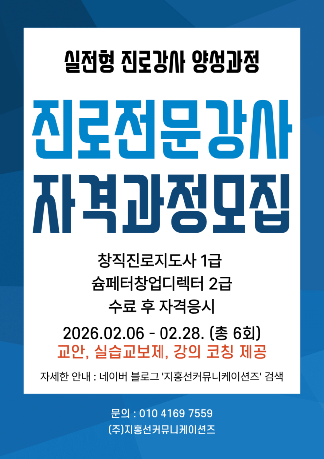 이제 현장에는 단순 강의가 아니라, 학습자가 스스로 선택하고 실행하도록 이끄는 전문성과 실무 역량을 갖춘 ‘진로전문강사’가 필요합니다.